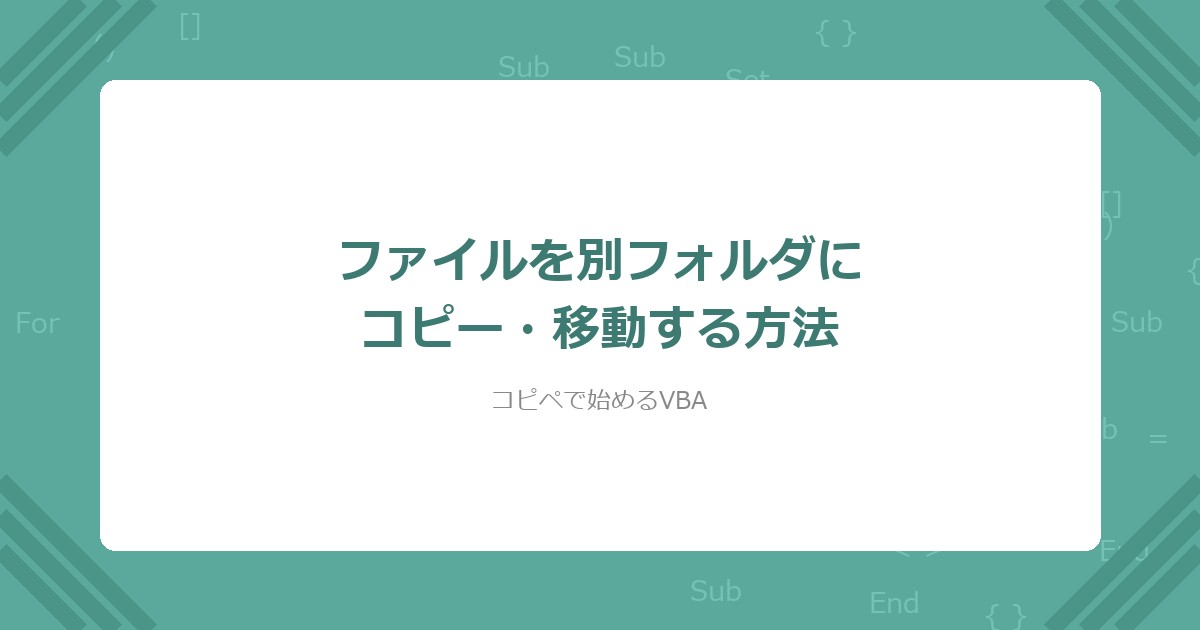 「【VBA】ファイル名を一括変更(リネーム)する方法」のコードと組み合わせて使える。コピー・移動した後にリネーム処理を実行する流れが効率的。