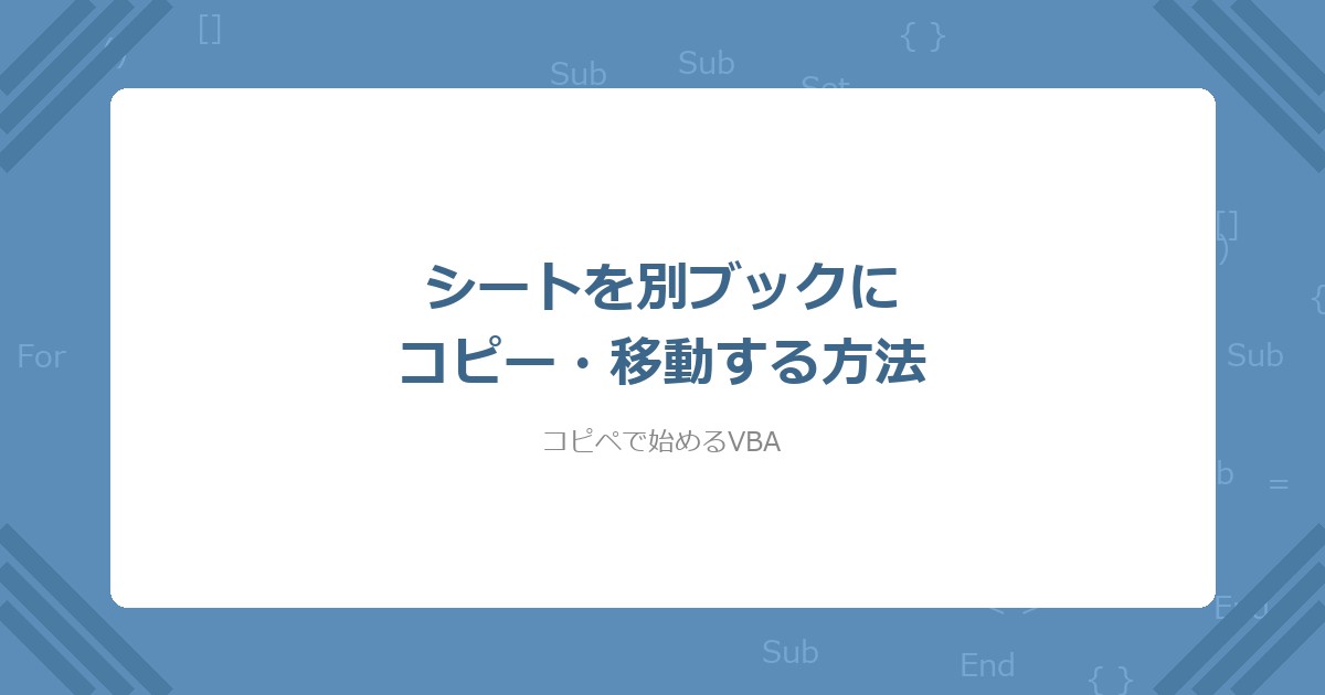 Sheets.Copy After:=で別ブックの末尾にシートをコピーできるSheets.Copy(引数なし)で新規ブックにコピーできるSheets.Moveは元ブックからシートがなくなる。必ずバックアップを取ってから使う- コピー先ブックは事前に開いておく必要がある