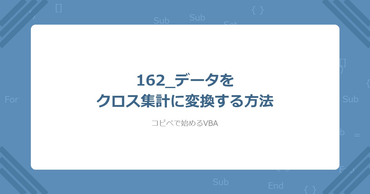 クロス集計はピボットテーブルでも作成できる。ピボットテーブルをVBAで自動生成する方法は 【VBA】ピボットテーブルをVBAで自動生成する方法 で解説している。「コードで自由にレイアウトを制御したい」「ピボットテーブルの操作が苦手」という場合は、本記事のDictionary方式がおすすめ。
