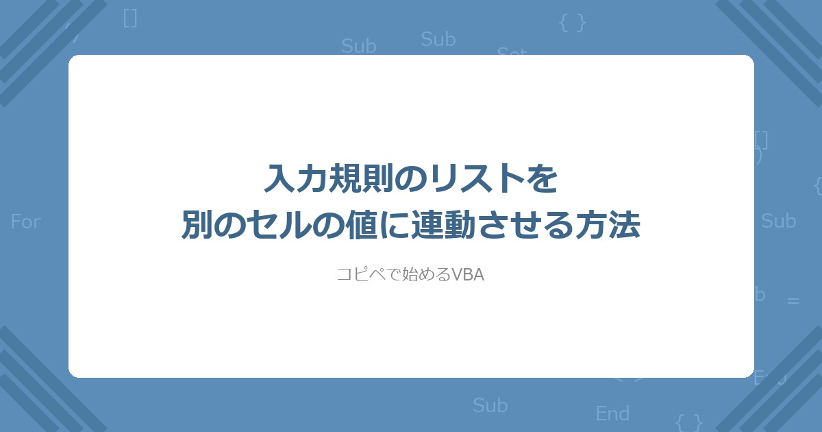 なお、Worksheet_Changeイベントの基本は セルの値が変わったら自動実行する方法 を参照。入力規則(Validation.Add)の基本的な設定方法は 入力規則(ドロップダウンリスト)をVBAで一括設定する方法 で解説している。