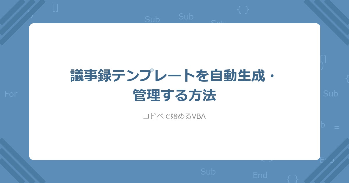 この記事では、VBAで議事録テンプレートを自動生成し、一覧管理・検索・PDF出力まで一括で行う方法を解説した。