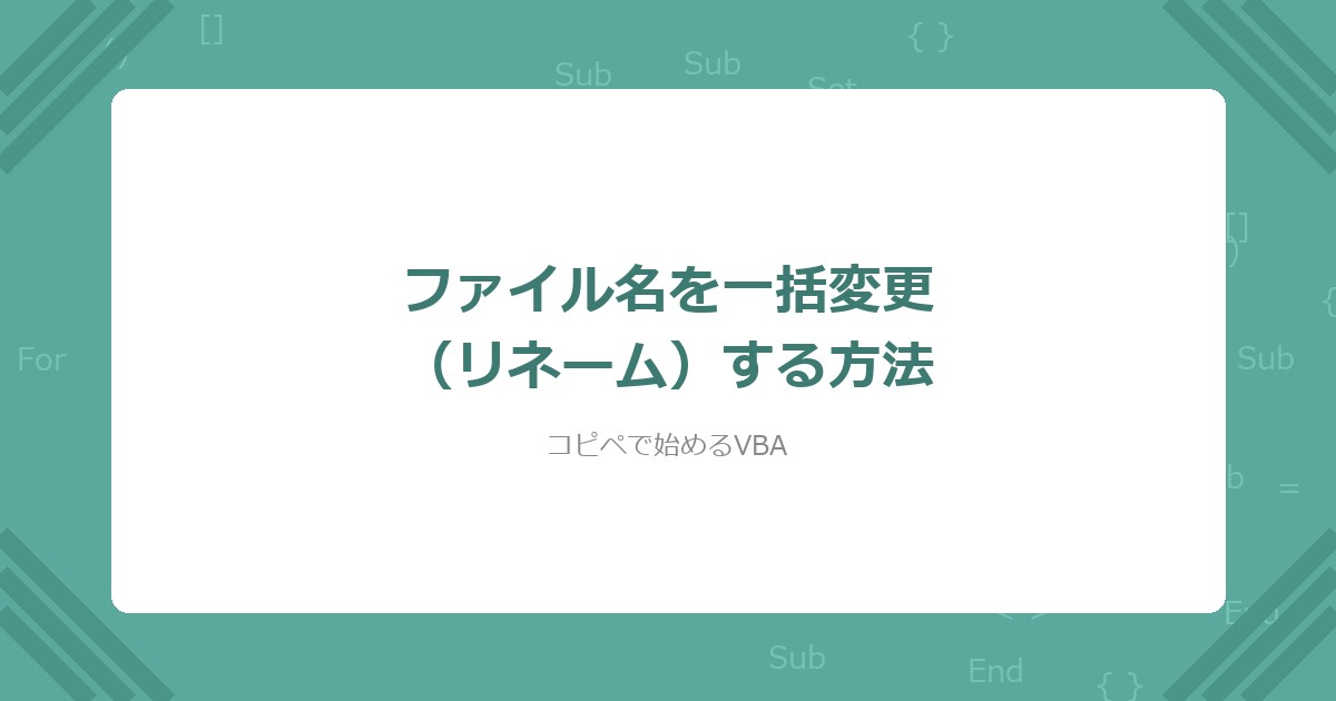 関連記事: リネーム表の旧ファイル名をExcelに自動出力したい場合は「【VBA】フォルダ内のファイル一覧をExcelに自動出力する方法」を参照。